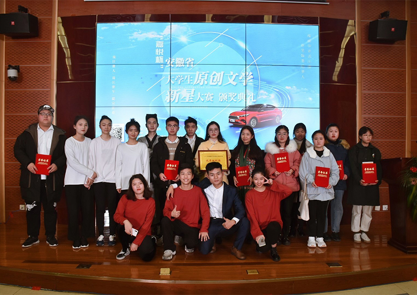 (通訊員:儲楚 黃海莉)2019年12月29日下午,“嘉悅杯”2019年安徽省大學生原創文學新星大賽頒獎典禮在安徽大學磬苑校區文典閣舉行。本次大賽由安徽教育廳主辦,安徽大學承辦,安徽江淮汽車集團、安徽廣電集團協辦,安徽大學副校長薛照明、安徽江淮汽車集團黨委副書記王東生、安徽省教育廳高等教育處處長粱祥君、安徽大學教務處處長高清維、安徽省作家協會主席許春樵、安徽大學文學院院長吳懷東和安徽大學文學院副院長王澤慶等省內外評審專家蒞臨典禮現場并為獲獎學生頒獎。