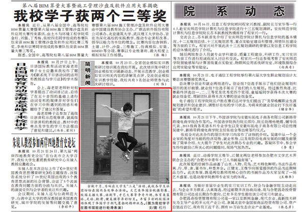 安徽新華學院教師代玲玲、學生記者金典撰寫的稿件《我校“創客夢工廠”正式開班》獲消息類二等獎,該文刊載于《安徽新華學院》報2015年第203期二版;學生記者金典撰寫的稿件《這是我的黃金時代》(指導教師:王友雅)獲通訊類二等獎,該文刊載于《安徽新華學院》報第204期二版;學生記者程丹的攝影作品《青春,無與“輪”比》(指導教師:代玲玲)獲新聞攝影類二等獎,該圖刊載于《安徽新華學院》報第202期二版;教師刁俊琴的攝影作品《皖南寫生,用畫筆點亮學生的未來》獲新聞攝影類三等獎,該圖刊載于《安徽新華學院》報第197期二版。